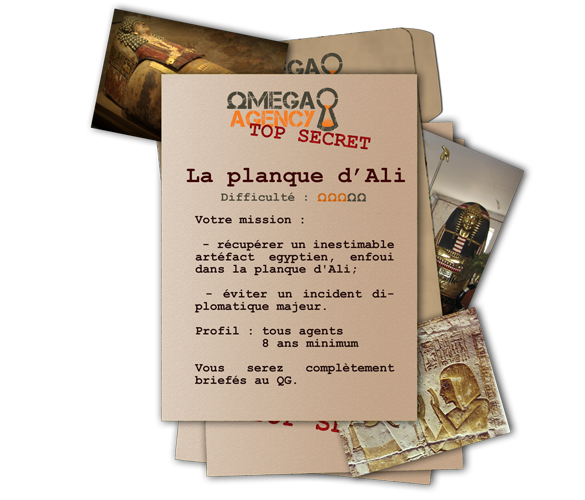 La planque d'Ali. Dans cette mission proposée par l'OMEGA AGENCY ESCAPE GAME à Lille, vous devez aller récupérer l'amulette de Toutankhamon, qui a été volée de son tombeau par Ali la Malice, le traficant le plus sournois de notre époque. c'est l'incident diplômatique qui nous pend au nez.
